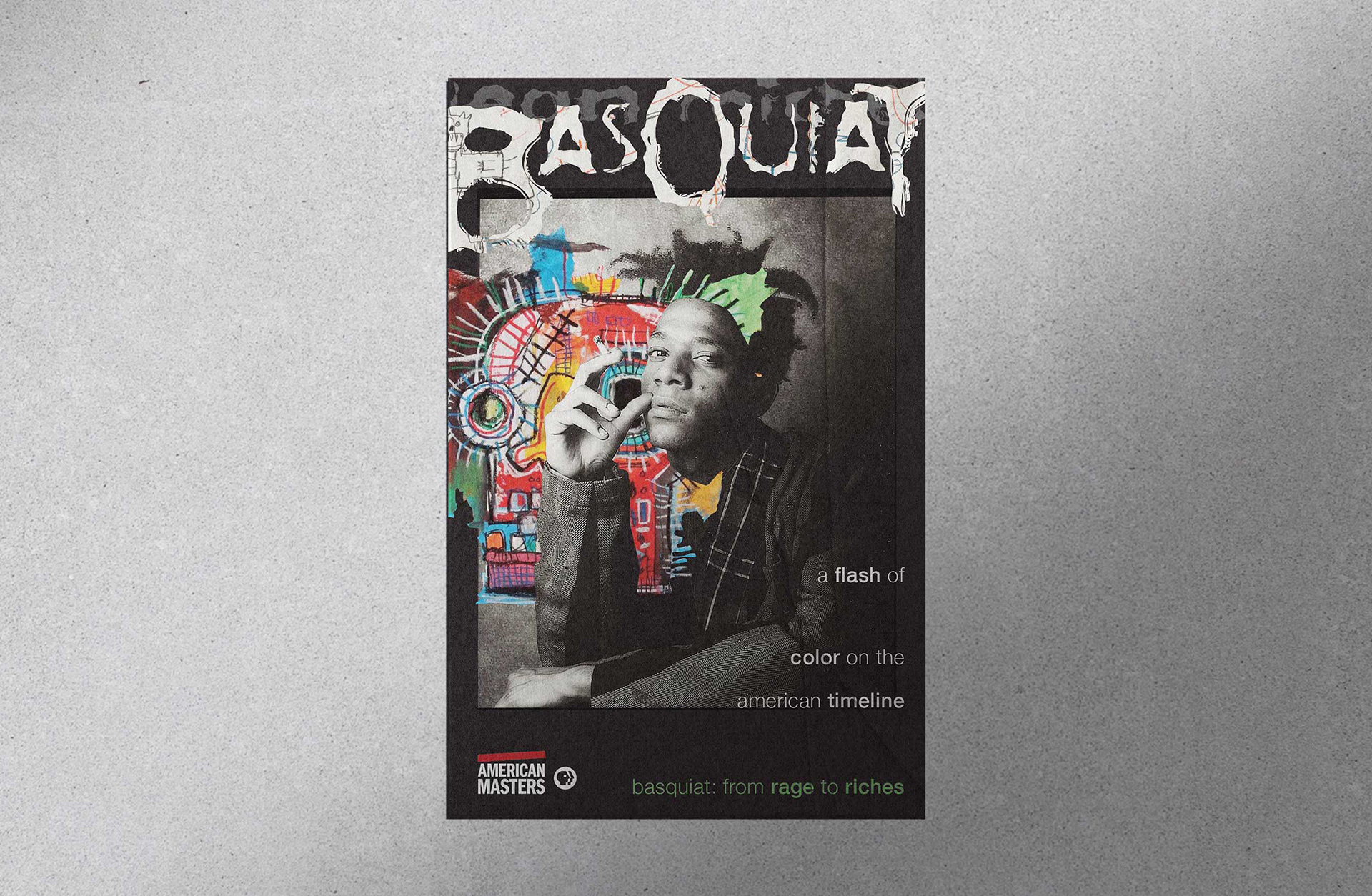 This ad poster series was developed to promote PBS’s American Masters TV series, which highlights a wide range of artists and their cultural impact throughout American history. Basquiat has uniquely colorful work, but many of his available picture portraits are in black and white, creating heavy contrast. This series is designed to blend his art with his photos to show how he was deeply intertwined with his work, as it represented his self-portraits, cultural upbringing, and social struggles. With the black and white versus color contrast, the sub-headline, “ a flash of color on the American timeline,” was developed, which recognized both his bold artistic style and his tragic passing. To further convey the relationship between him and his work, the title uses a lower contrast piece that is embedded into “Basquiat” while letting “Jean Michel” give dimension and be used for visual support.