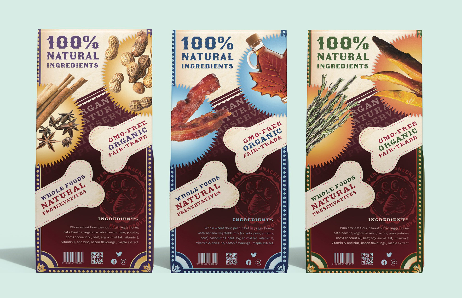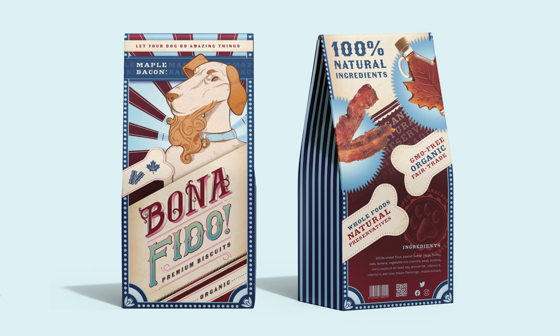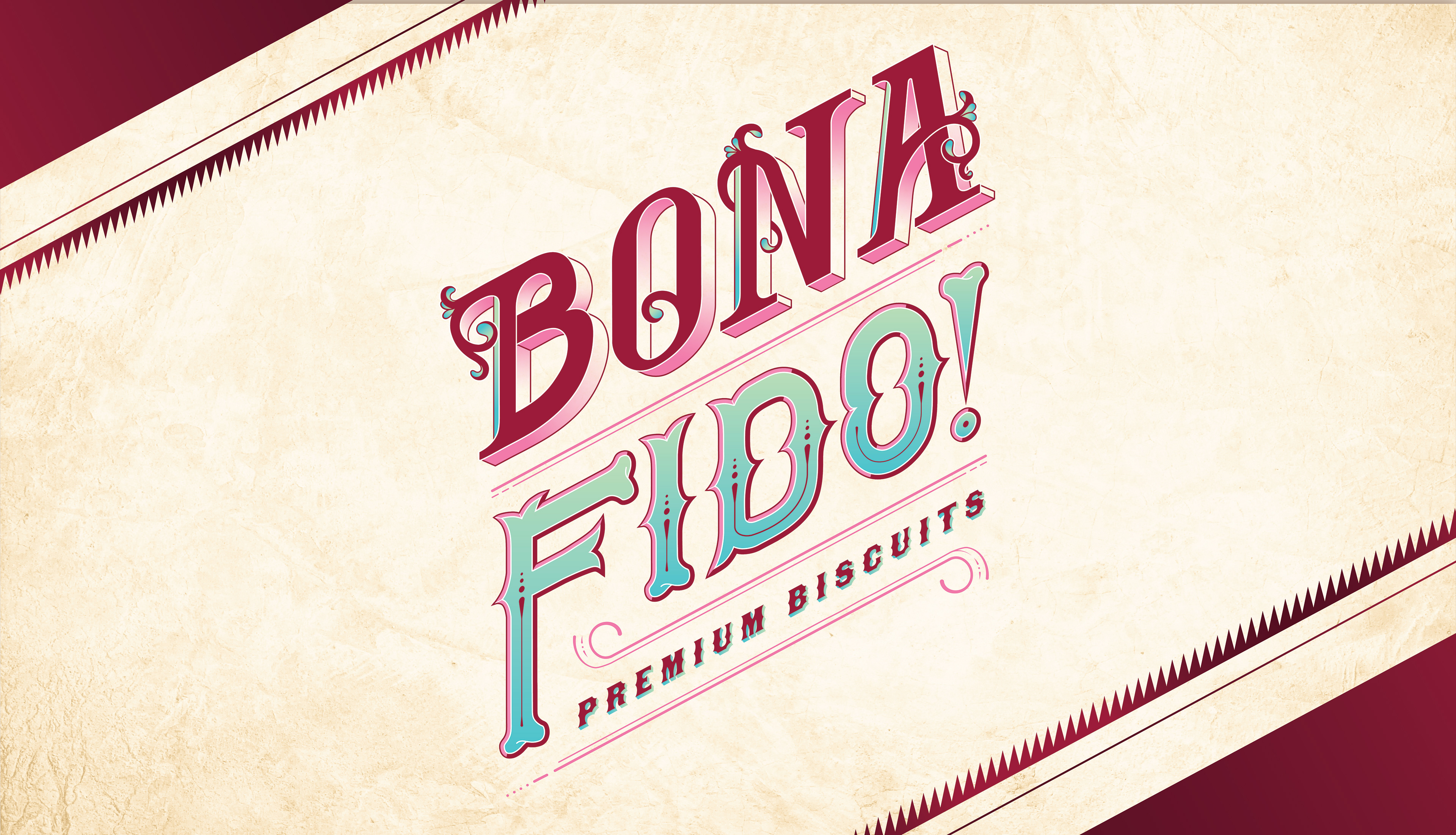 Bona Fido Biscuits is a line of premium dog treats designed to fit in HEB’s in-house selection of high-end products. The concept for this packaging is inspired by late 19th century circus posters and the way they highlight the bold and talented in many of their strange and skilled performances. The idea takes imagery used to frame these unique acts and communicate that same rhetoric for dog owners, that this product will help their own special dog be at their top performance with all of the offered health benefits. The name speaks to the organic and natural ingredients used to make the treats, while the title treatment is hand lettered to fit the specific era of typography and poster narrative.