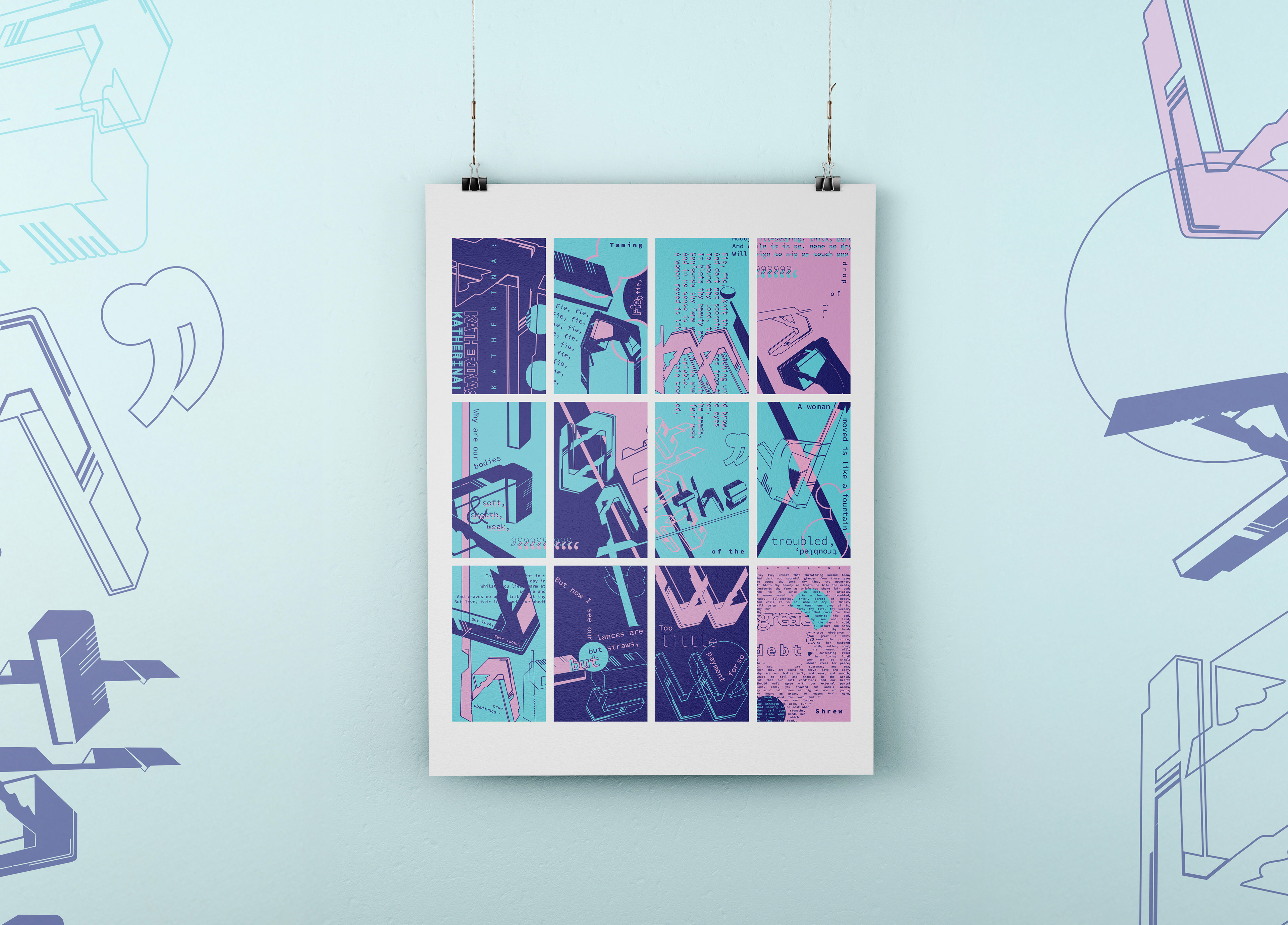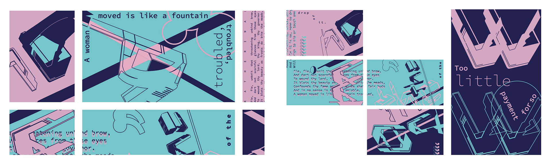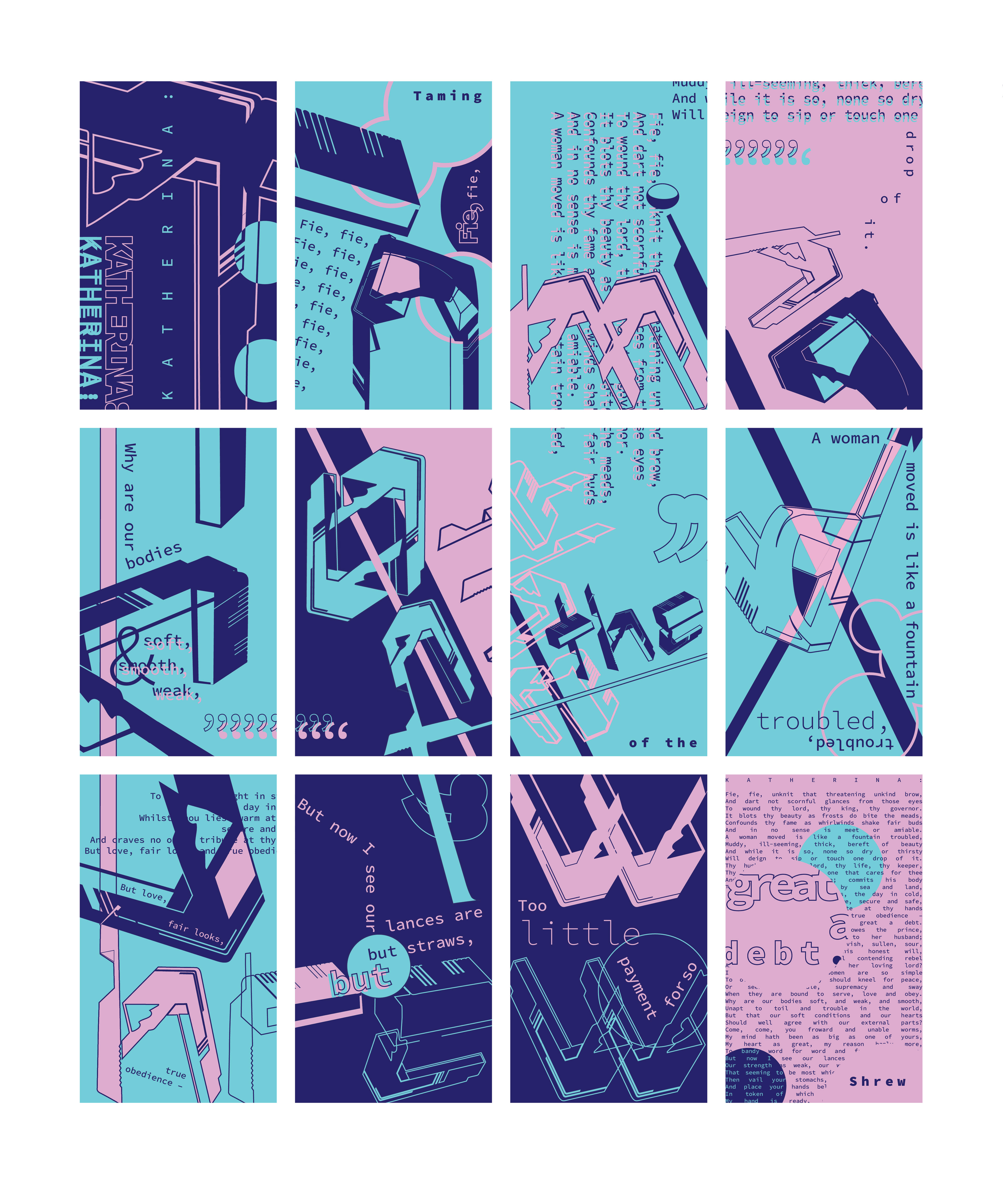 The poster came from the long process of collecting, collaging, and experimenting with type form. From found images of old computers in the CSULB library, I used shapes and edges collected from different angles to create the letters that spell Shakespeare’s Taming of the Shrew. After finalizing each letter, I created a type poster to highlight the unique form of this type exploration through a 12-panel format.